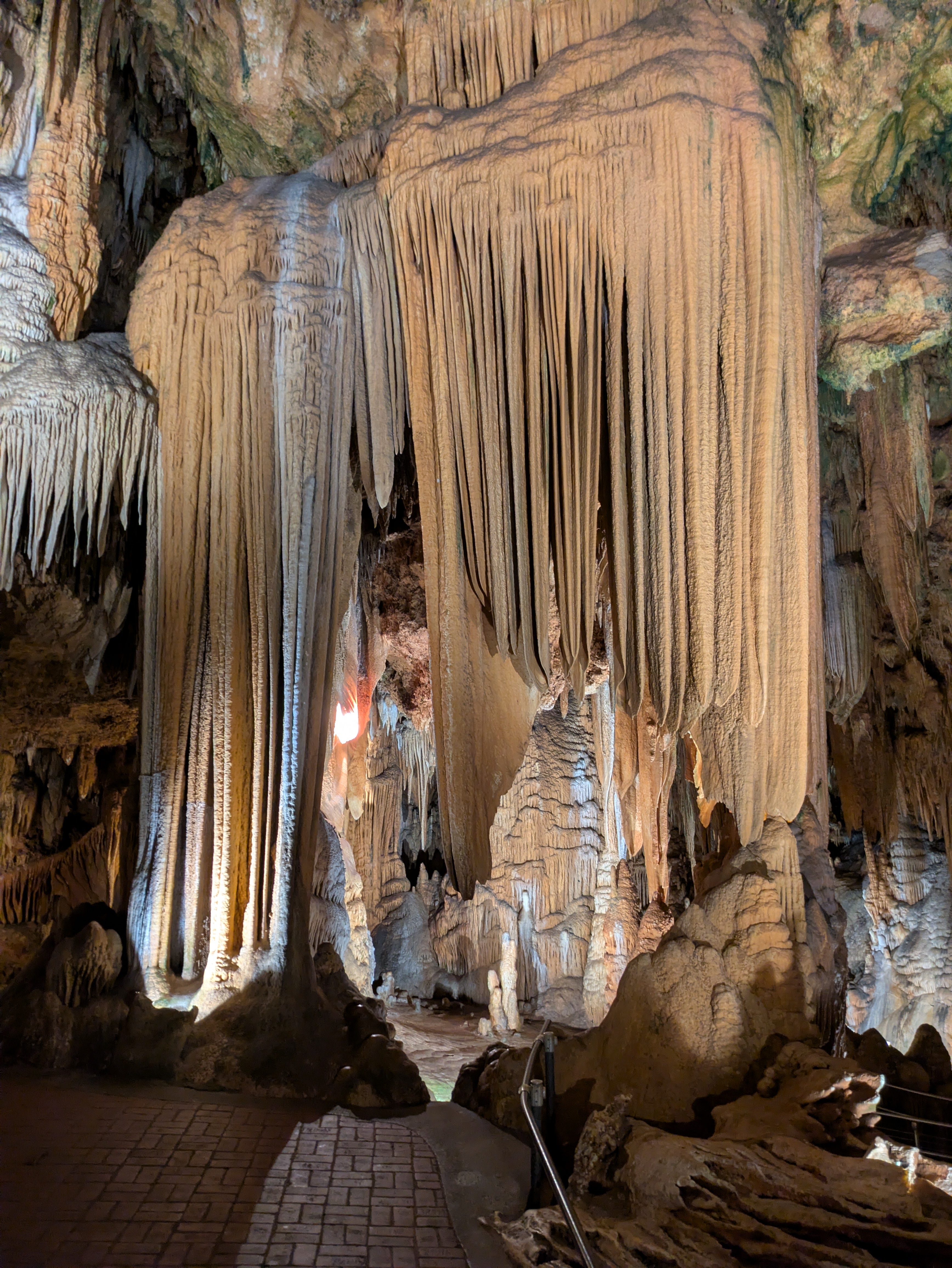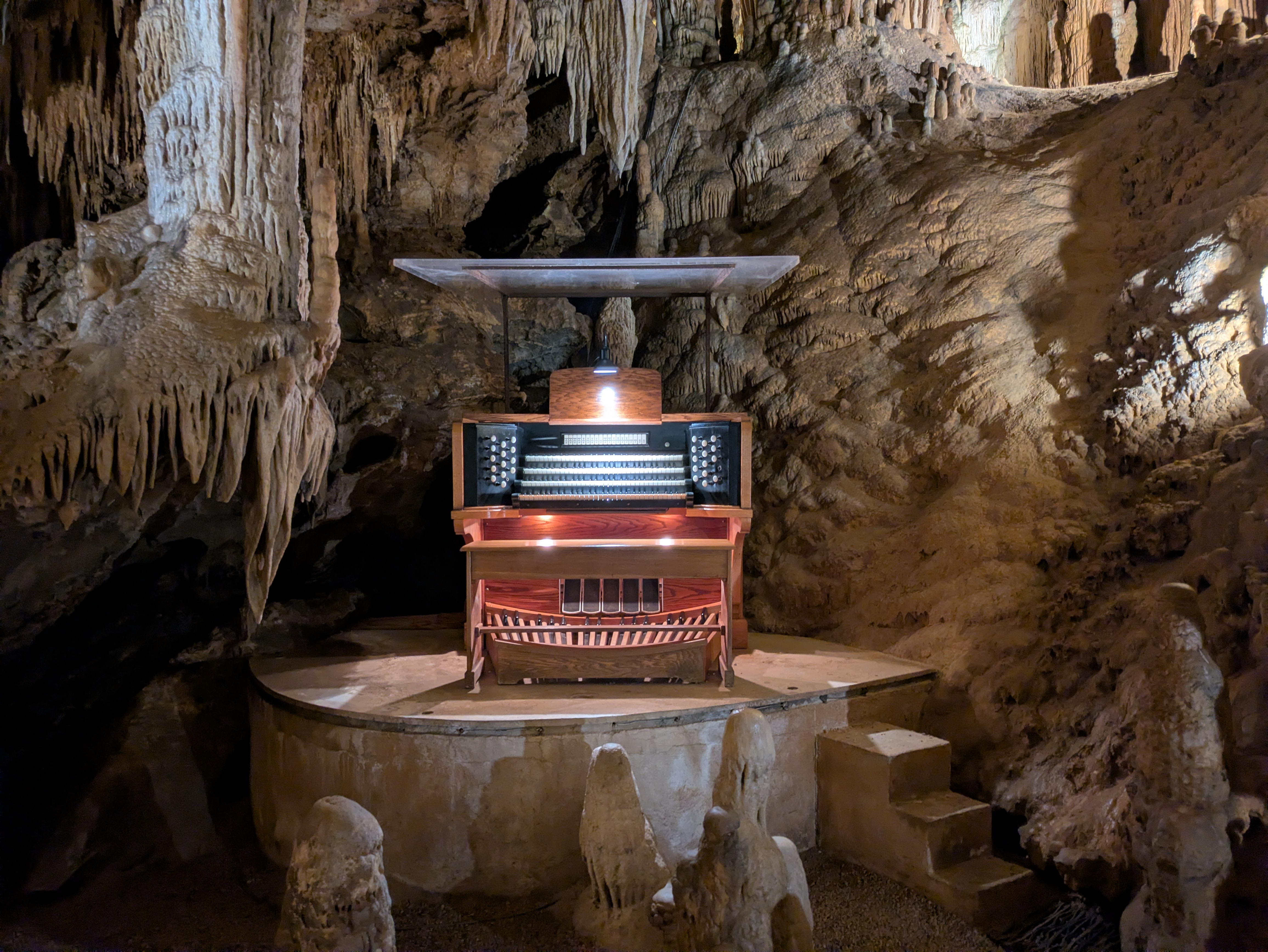 The pamphlet you receive coordinations numbered stops to different rooms along the path. The route is about 1.25 miles long and leads through massive caverns with ceilings that soar stories high. One of the highlights is the Great Stalacpipe Organ, the largest musical instrument in the world. It was invented by mathematician and electronics engineer Leland W. Sprinkle. The organ uses electronically-triggered, rubber-tipped mallets to gently tap selected stalactites, each tuned to specific notes. The result? A natural symphony created entirely by the caverns themselves.